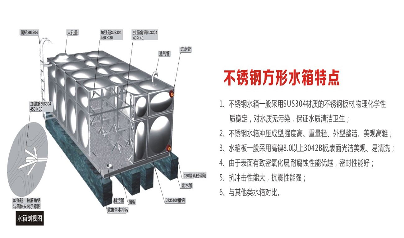 不銹鋼水箱是繼玻璃鋼水箱之后新一代水箱產(chǎn)品,其產(chǎn)品采用SUS304不銹鋼板精工模壓而成,造型美觀,經(jīng)濟(jì)實(shí)用,主體長久不壞。不銹鋼水箱與其他水箱相比,具有外形美觀、重量輕、強(qiáng)度高、耐腐蝕、耐高溫、水質(zhì)清潔,防滲,抗震,永不生青苔,水質(zhì)無二次污染,安裝方便,無需維修,便于清洗等諸多優(yōu)點(diǎn)。